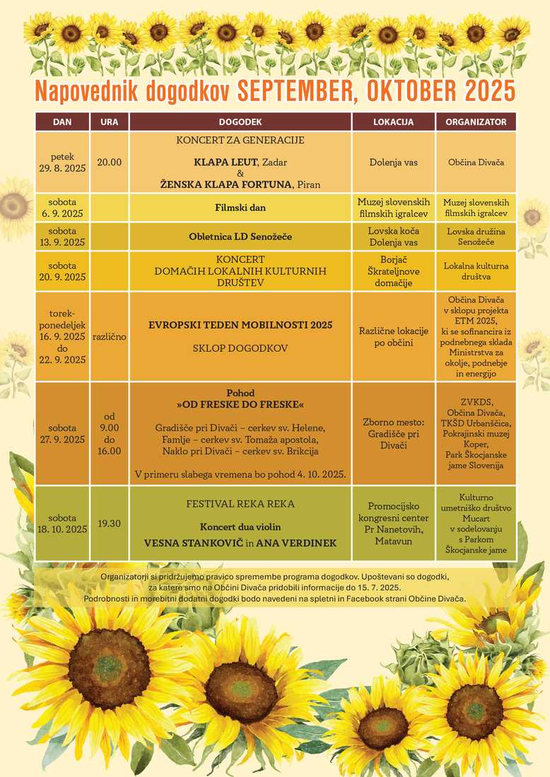 Dogodke organizirajo Občina Divača, kulturna in turistična društva ter številni partnerji, ki s sodelovanjem skrbijo za živahen in raznolik utrip skupnosti.