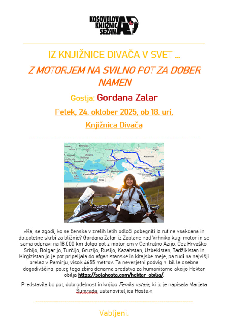 Knjižnica Divača vabi na navdihujoče potopisno srečanje z Gordano Zalar, ki bo predstavila svojo izjemno zgodbo o pogumu, dobrodelnosti in življenjski pustolovščini.
