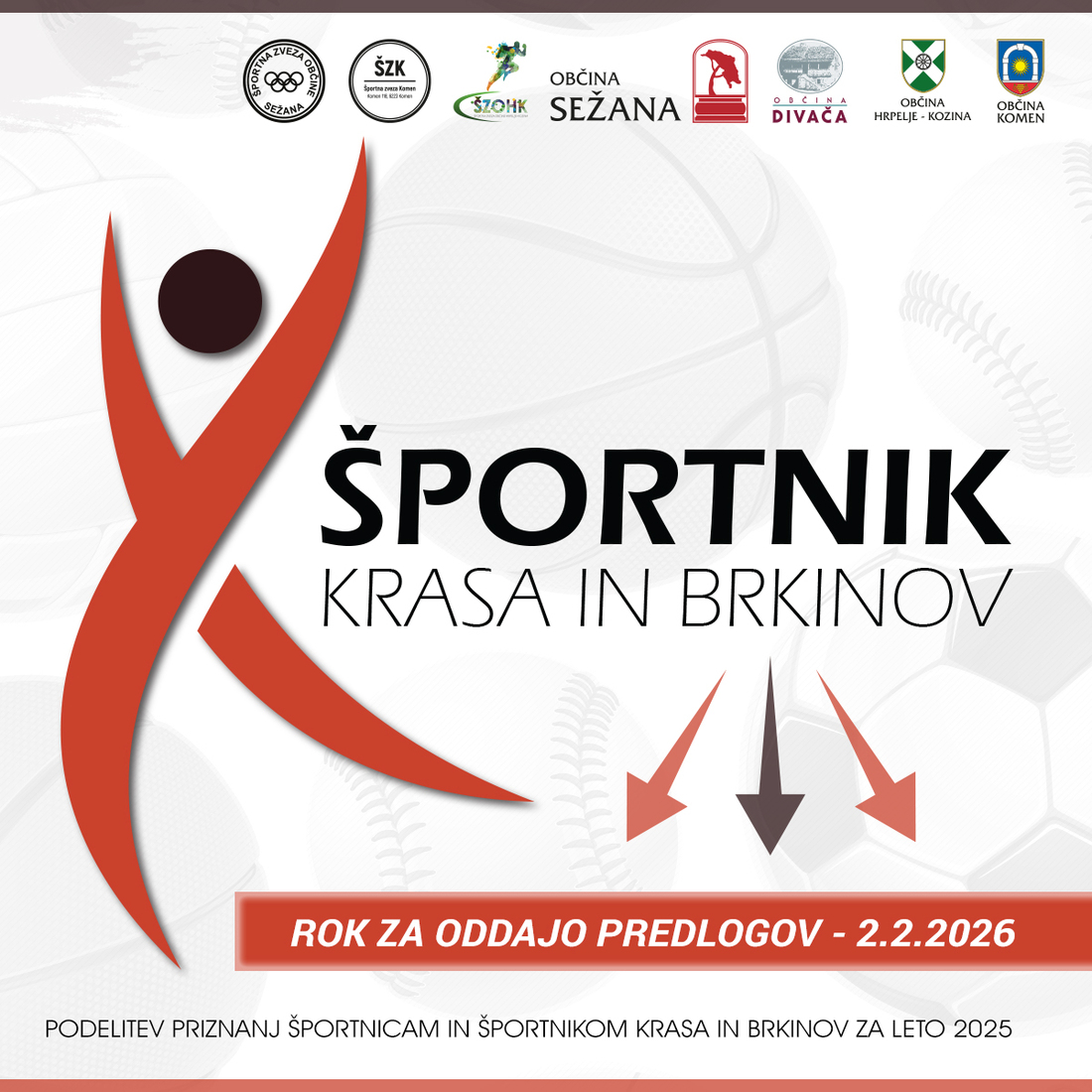 Športna zveza Divača, Občina Divača, Športna zveza občine Hrpelje–Kozina, Športna zveza Komen, Športna zveza občine Sežana zopet začenjamo »nov krog« projekta ŠPORTNIK KRASA IN BRKINOV. Vabimo vse upravičene zainteresirance k oddaji predlogov za podelitev priznanj športnikom in športnim delavcem za dosežke v letu 2025.