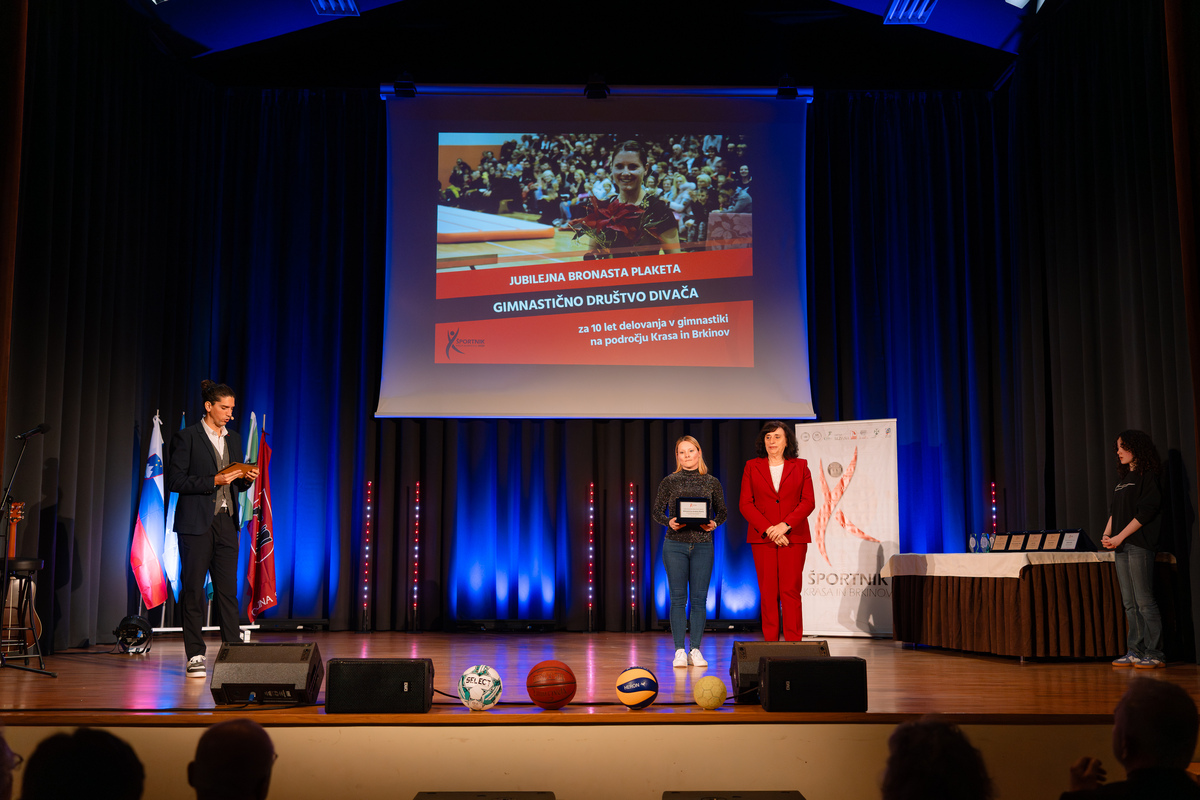 Posebej smo ponosni na nagrajence iz Občine Divača. Med prejemniki priznanj so Gimnastično društvo Divača, ki je prejelo jubilejno bronasto plaketo za deset let delovanja, ekipa 3x3 Klančar Žerjavi, v kateri igrata tudi občana Aljaž Tavčar in Enej Čebron, ter Naja Ferfila.