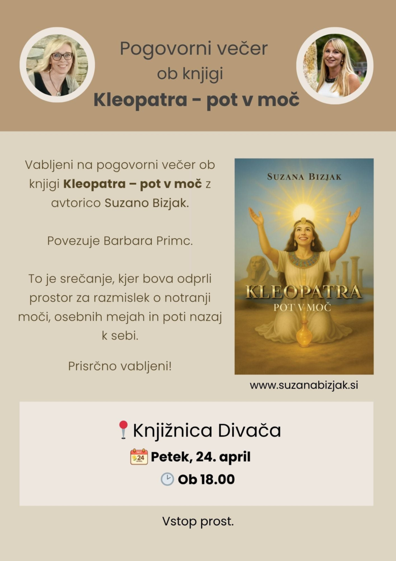 Knjižnica Divača vabi na pogovorni večer ob knjigi Kleopatra – pot v moč, ki bo v petek, 24. aprila 2026, ob 18. uri v prostorih Knjižnica Divača.