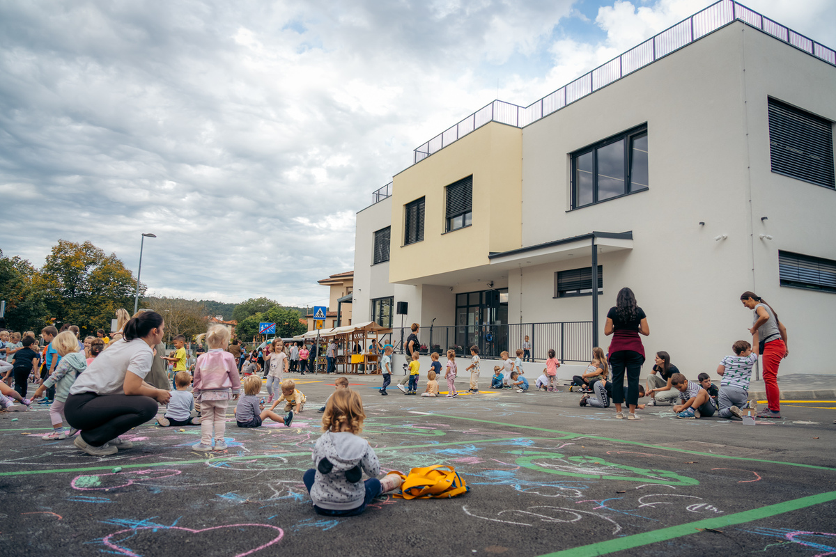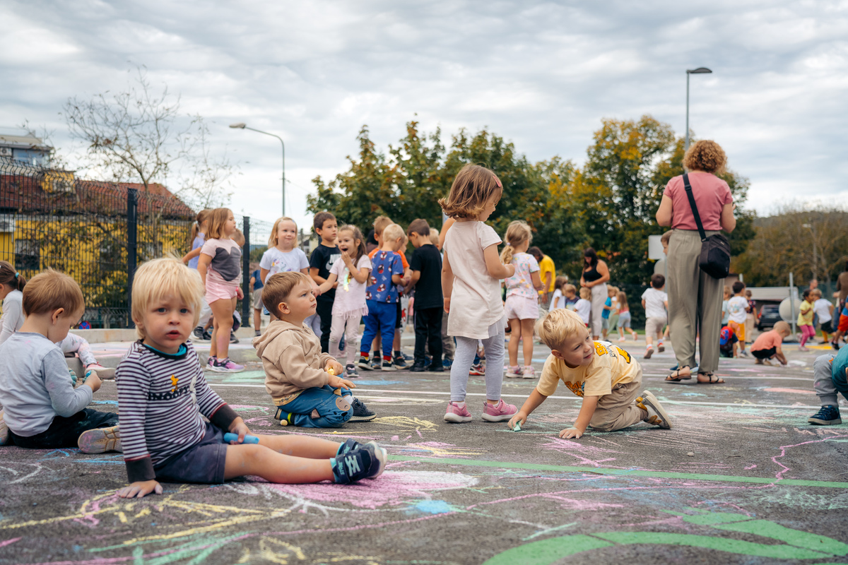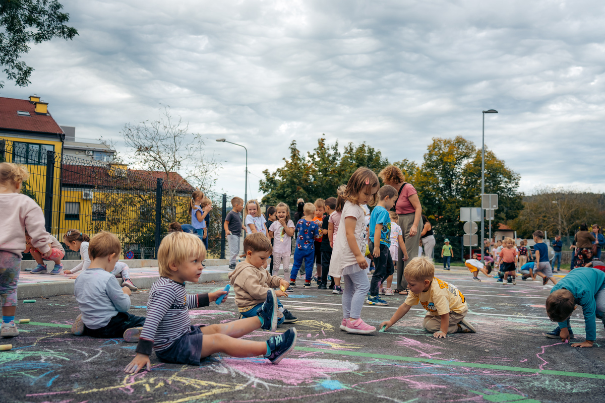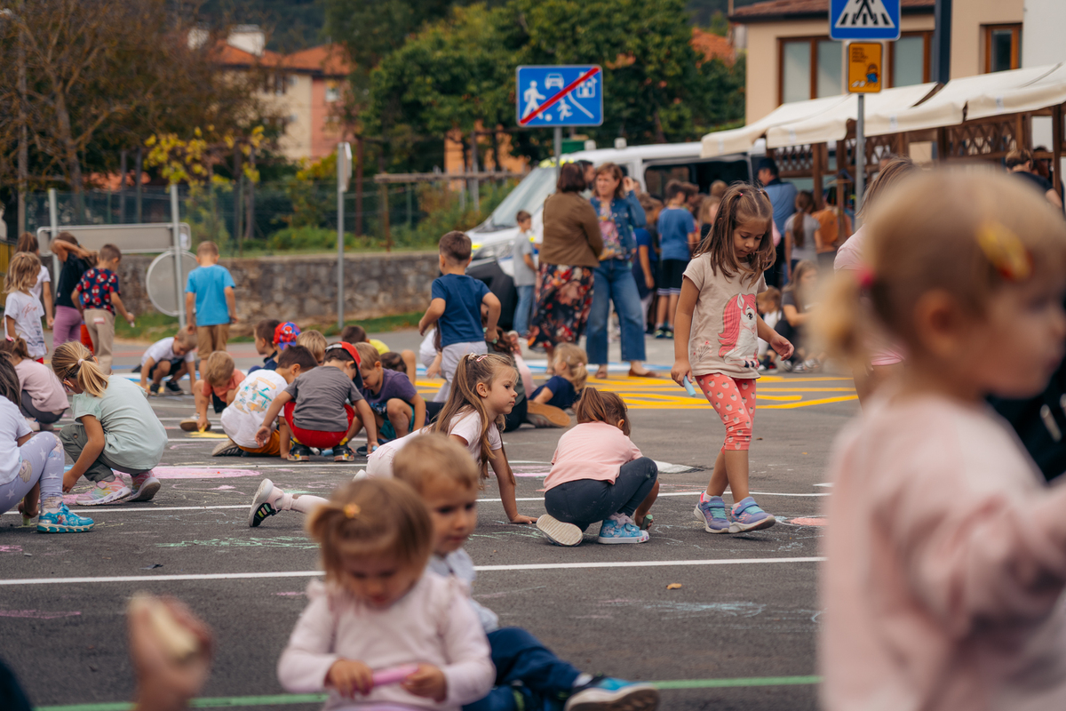 Zaprta ulica je postala pravljična – otroci Vrtca Divača so z barvnimi kredami, igrami, plesi in izštevankami oživili asfalt, drevesa in pločnik.