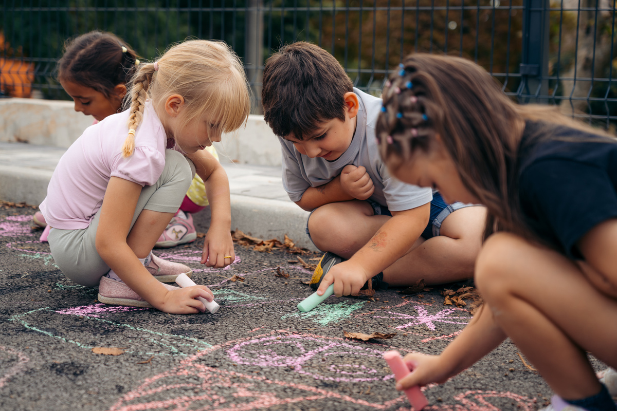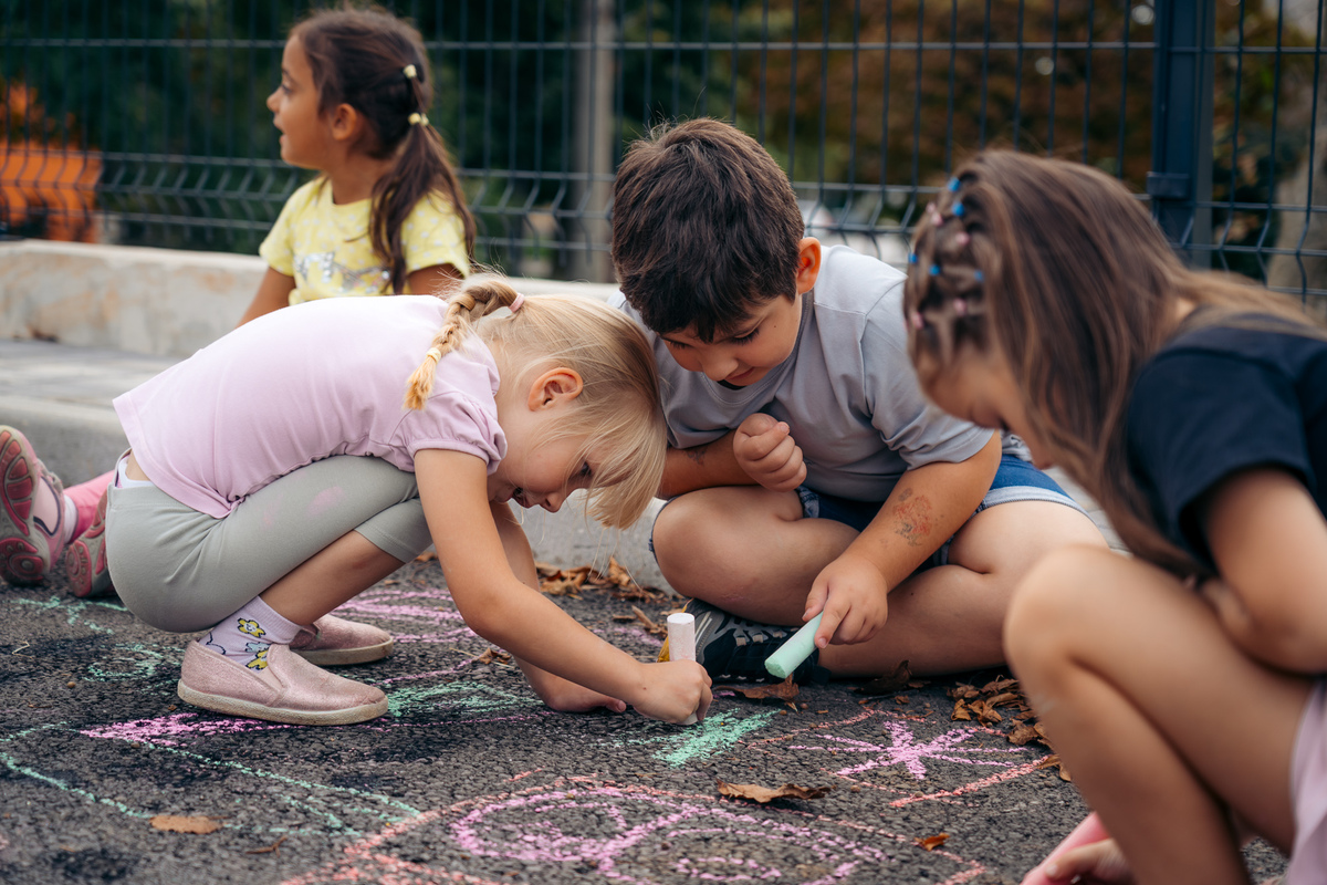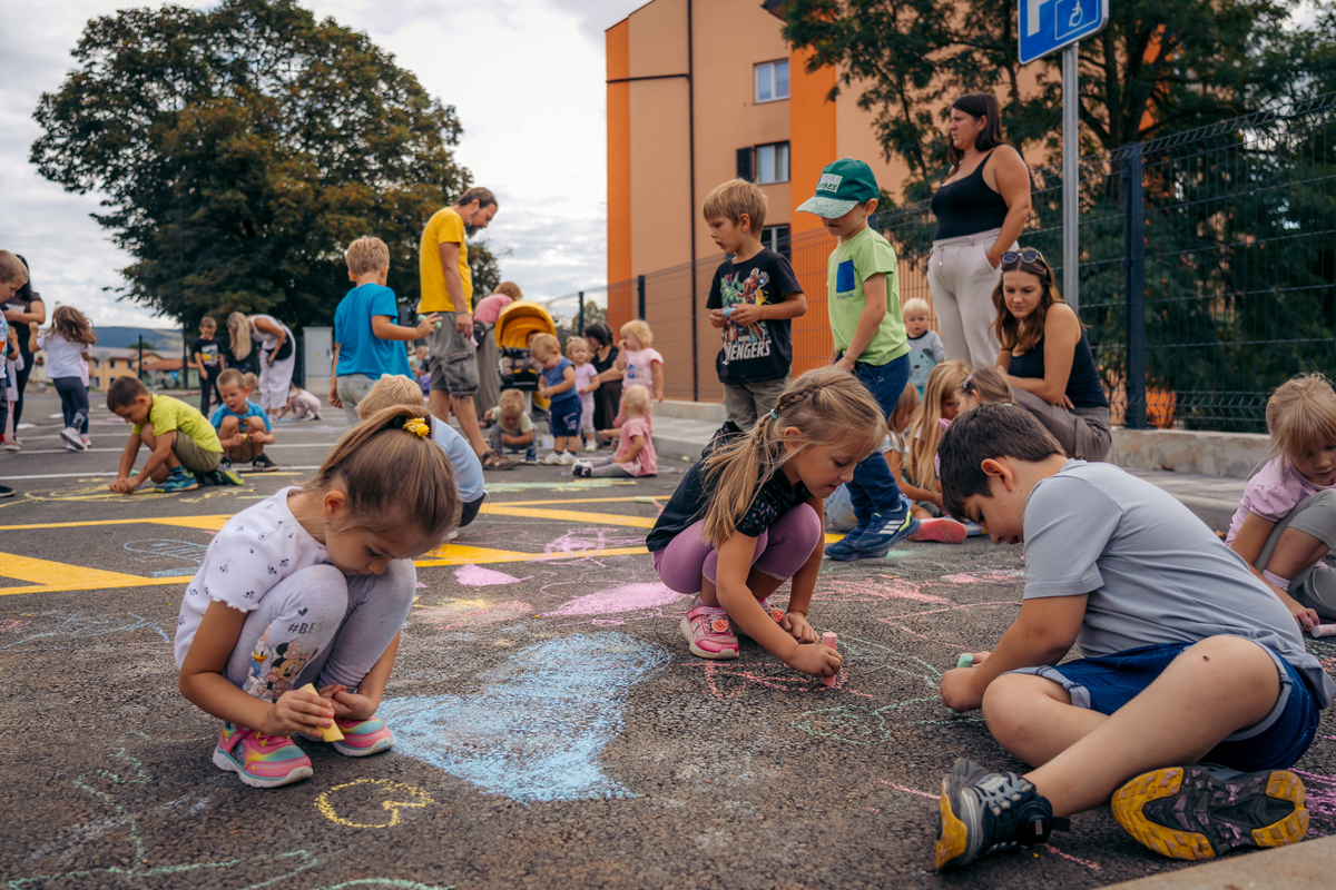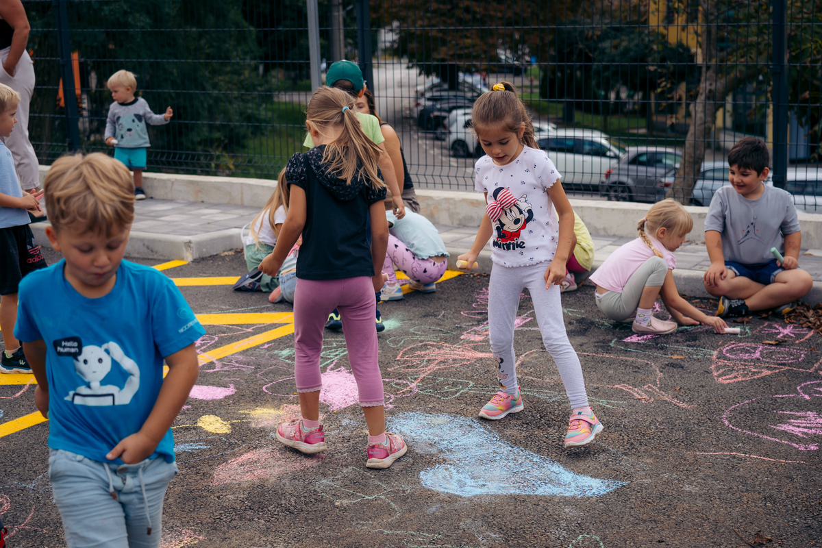 Zaprta ulica je postala pravljična – otroci Vrtca Divača so z barvnimi kredami, igrami, plesi in izštevankami oživili asfalt, drevesa in pločnik.