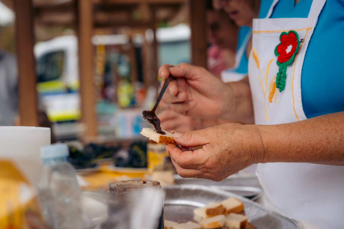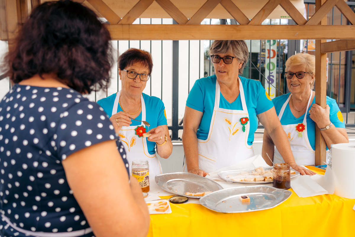 Na stojnici Aktiva žena KUD Pepca Čehovin Tatjana Senožeče so obiskovalce pričakali med, domača slivova marmelada, sadje in kruh.