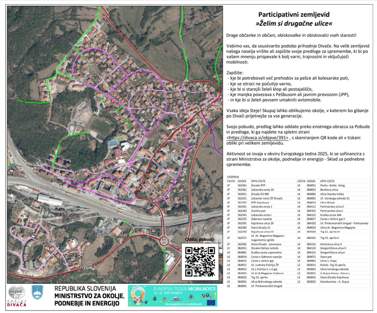 Vabimo vas, da soustvarite podobo prihodnje Divače. Na velikem zemljevidu naselja, ki je nameščen na vratih novega prizidka Osnovne šole Divača, lahko zabeležite svoje predloge za spremembe, ki bi po vašem mnenju prispevale k bolj varni, trajnostni in vključujoči mobilnosti. Akcija še vedno traja!