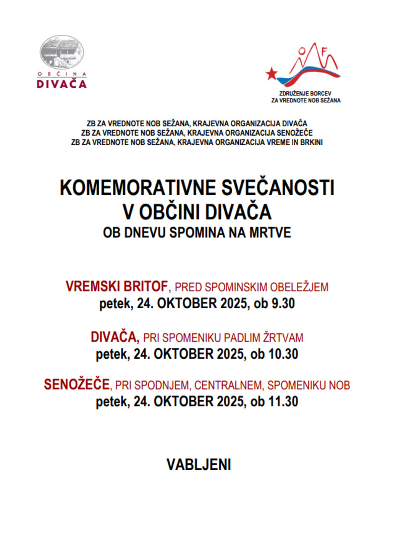 Zveza združenj borcev za vrednote NOB Sežana – krajevne organizacije Divača, Senožeče ter Vreme in Brkini – vabijo na komemorativne svečanosti v občini Divača, ki bodo potekale v petek, 24. oktobra 2025, po naslednjem razporedu: