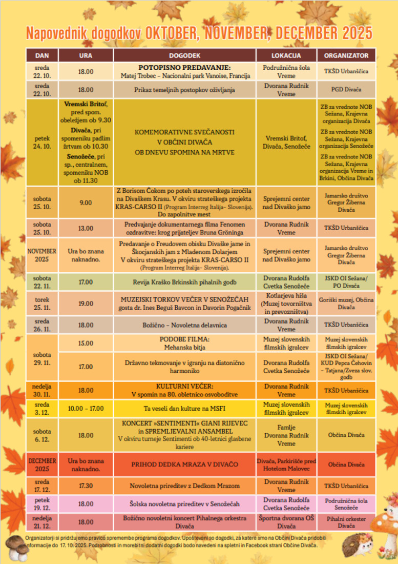 Mesec se bo začel s projekcijo dokumentarnega filma Fenomen ozdravitve v Dvorani Rudnik Divača (2. november). Sledil bo zanimiv pogovor o življenju Josipa Jurčiča v okviru projekta KRAS–CARSO II, ki ga pripravlja Jamarsko društvo Gregor Žiberna (datum bo objavljen naknadno). Konec meseca prinaša tradicionalno Revijo Kraško Brkinskih planinskih gob (22. november) ter Muzejski torkov večer v Senožečah, kjer bosta gosta dr. Ines Beguš Bavcon in Devan Poganik (25. november). Dan pozneje bo v Muzeju slovenskih filmskih igralcev potekala delavnica PODOBE FILMA, ki bo obiskovalce popeljala v svet mehanske bitja in filmske ustvarjalnosti (26. november).