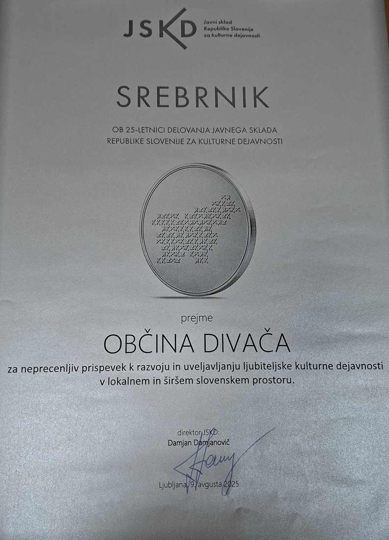 Občina Divača prejela priznanje Javnega sklada Republike Slovenije za kulturne dejavnosti