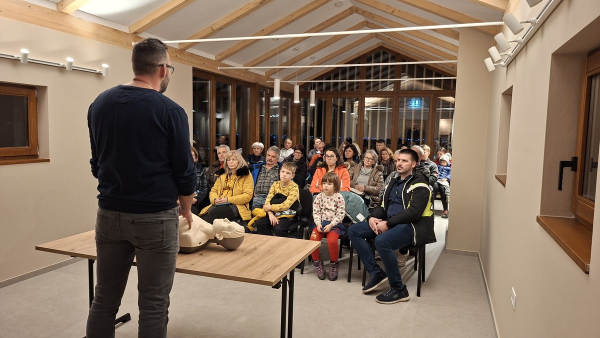 Po namestitvi je sledilo izobraževanje o temeljnih postopkih oživljanja in uporabi AED. Prostore za izvedbo izobraževanja je prijazno odstopil domačin Dejan Hreščak, za kar se mu lepo zahvaljujemo.