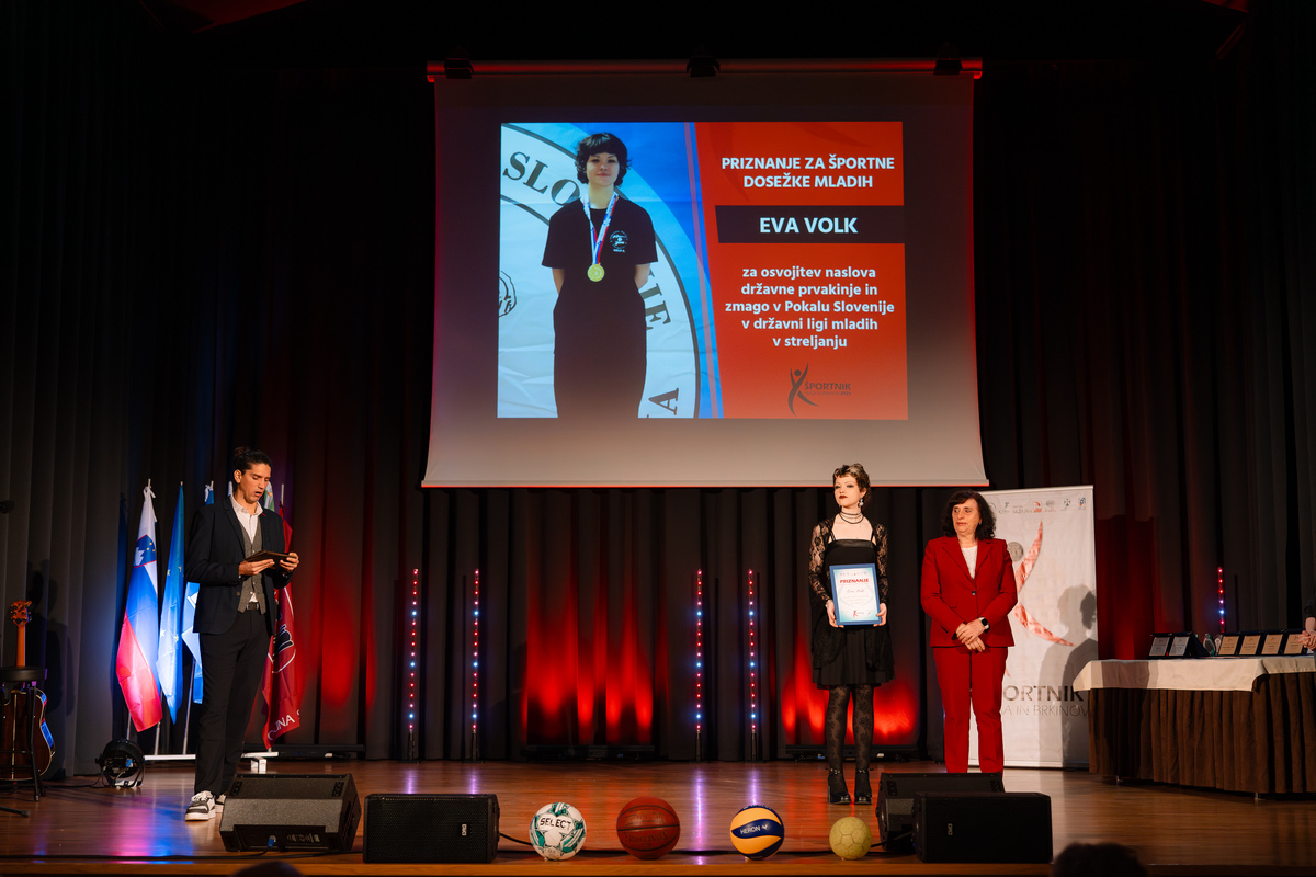 Eva Volk za osvojitev naslova državne prvakinje in zmago v Pokalu Slovenije v državni ligi mladih v streljanju z zračno in malokalibrsko pištolo